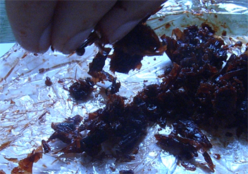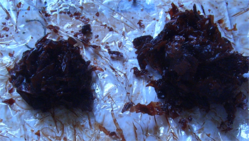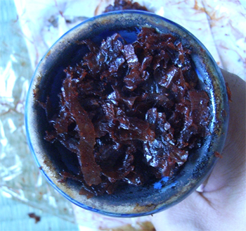 , シーシャフレーバの葉を指で揉み解します。 2 の写真で揉み解す前と後の量の変化を見てください。一度に使うタバコの量は、使うパイプによって違いますが、トルコやシリア製のものは大体 50 グラムの箱で1 /4 ~ 1/6 、イラン製のものは 1/2~1/3 ほどが目安です。ヘッドの大きさによります。 1.