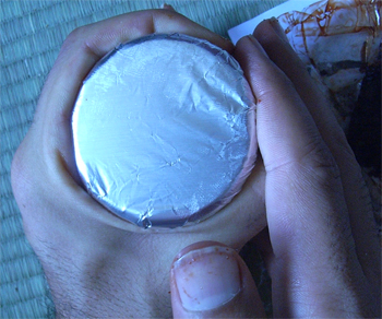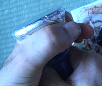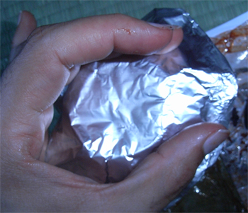 片手を使って空気が隙間から入らないように、ぴったりとアルミホイルをかぶせます。側面をよく押さえつけてください。